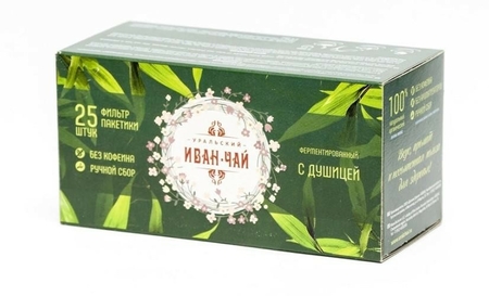 Уральский Иван-чай в фильтр-пакетах, с душицей. Упаковка - картонная коробка, 25 чайных пакетиков. Чай ферментированный, без кофеина, ручной сборки. |